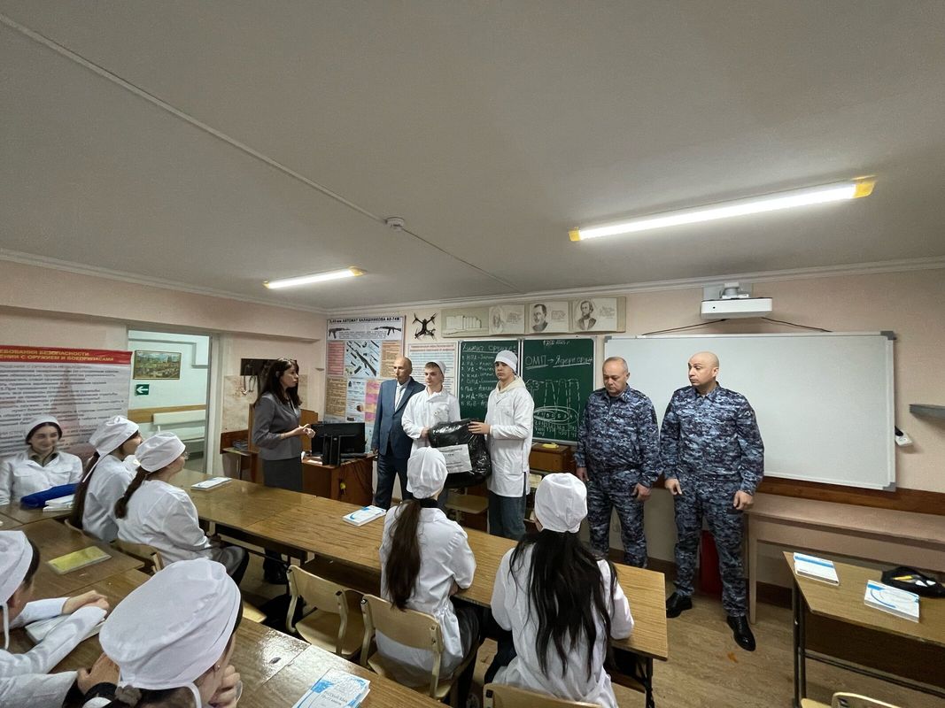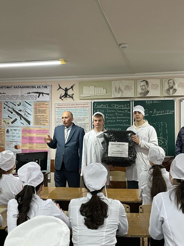 В военном классе СОМК состоялась очередная передача маскировочных сетей Помощнику Главы республики Кусаеву Маирбеку Витальевичу и сотрудникам Росгвардии. Маирбек Витальевич поблагодарил директора Ревазова Т.Д. за ту огромную работу по патриотическому воспитанию подрастающей молодежи, которая проводится в стенах колледжа. Поблагодарил и студентов за тот неоценимый вклад, который они вносят в нашу общую победу.